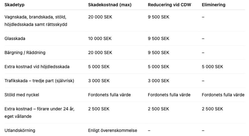 Självrisk: Vid skada, stöld eller förlust ansvarar Hyrestagaren upp till avtalad självrisk. Beloppet framgår av bokningsbekräftelsen.